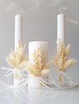 Лаконічний та вишуканий набір із трьох свічок для церемонії «Сімейне вогнище», виконаний у чистому білому кольорі. Вертикальна фактура додає сучасності, а м’яке світло полум’я красиво підкреслює текстуру поверхні.Свічки оздоблені делікатною композицією з лагурусу та сухоцвітів у натуральній кремовій гамі. Повітряні трави та прозора стрічка створюють легкий, романтичний акцент без перевантаження деталями.Цей набір ідеально підійде для весілля у стилі minimalist, modern, classic або boho.Особливості:- елегантний білий колір
