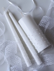 Ніжний набір білих свічок для весільної церемонії, виконаний у лаконічному та елегантному стилі. Комплект складається з двох тонких свічок і центральної свічки, прикрашених делікатним декором у вигляді маленьких перлин. Стриманий дизайн надає свічкам особливої витонченості та робить їх гармонійним доповненням до весільної церемонії або святкового декору.В комплект входить:- 2 конусні свічки - 2,2х25 см