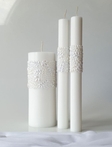 Елегантний набір білих свічок для весільної церемонії, виконаний у стриманому класичному стилі. Свічки прикрашені витонченим рельєфним декором, що нагадує ніжне мереживо та створює особливий святковий настрій. Гармонійне поєднання центральної свічки та двох тонких свічок символізує єдність і стане красивим акцентом під час важливого моменту церемонії.В комплект входить:- 2 циліндричні свічки - 2,6х25 см